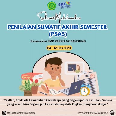 Selamat Melaksanakan Penilaian Sumatif Akhir Semester (PSAS) Siswa dan Siswi SMK Persis 02 Kota Bandung.Ujian ini bukanlah akhir dari pembelajaran, tapi itu adalah awal dari banyak pengalaman. ุงูููููููู ูู ูุงู ุณููููู ุฅููุงูู ู ูุง ุฌูุนูููุชููู ุณููููุงู ููุฃูููุชู ุชูุฌูุนููู ุงููุญูุฒููู ุฅูุฐูุง ุดูุฆูุชู ุณููููุงู Tidak ada hasil yang mengkhianati proses, dan sekarang adalah waktunya untuk melihat bagaimana hasil dari […]